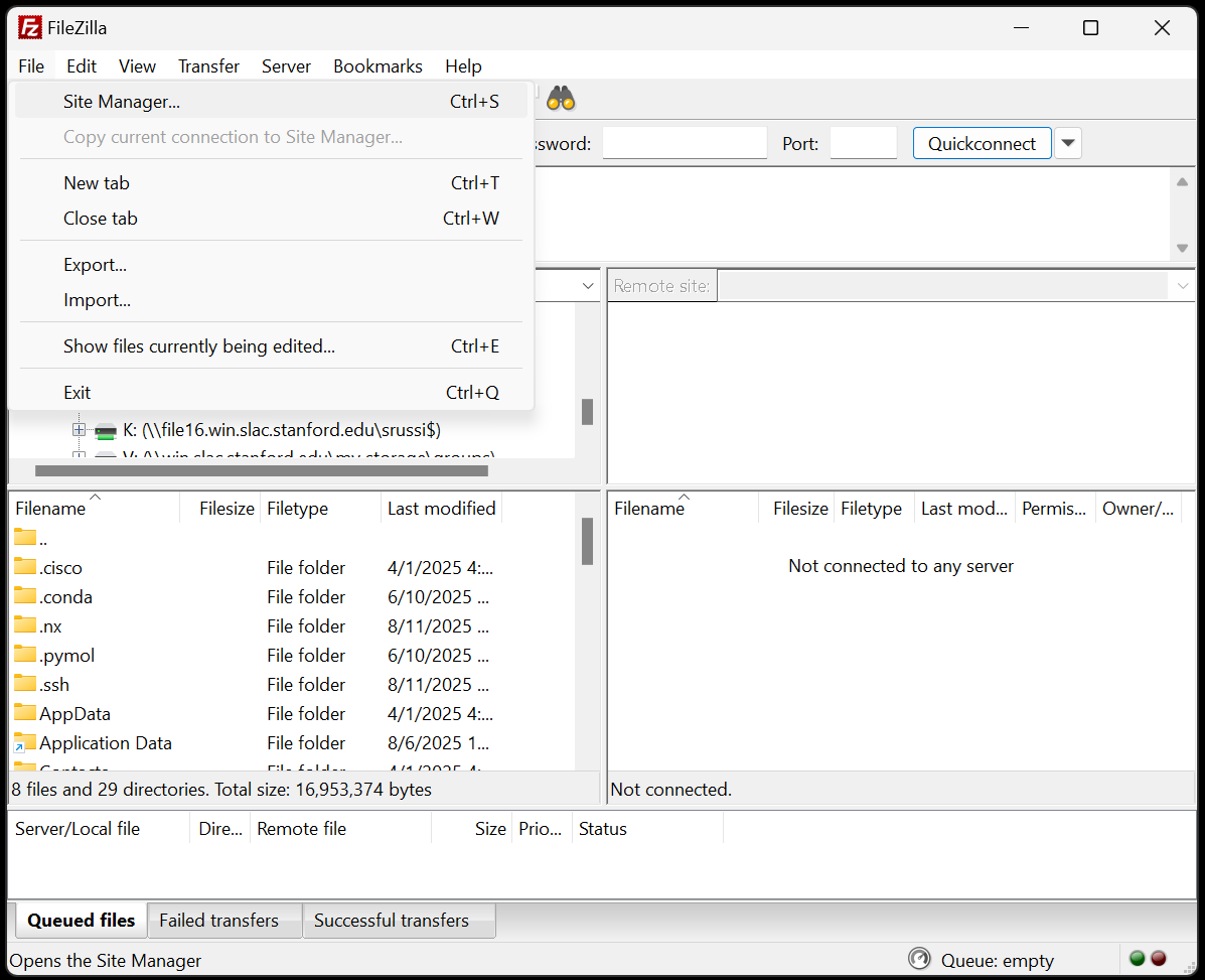 Installing and configuring FileZilla clientThis document briefly describes how to download and configure FileZilla client to enable remote access to smbcopy.slac.stanford.edu to back up the data. Download and installationDownload the package of FileZilla client that matches your operating system (Windows, Mac OS X or Linux). Follow the installation instructions provided on the FileZilla site. Configure