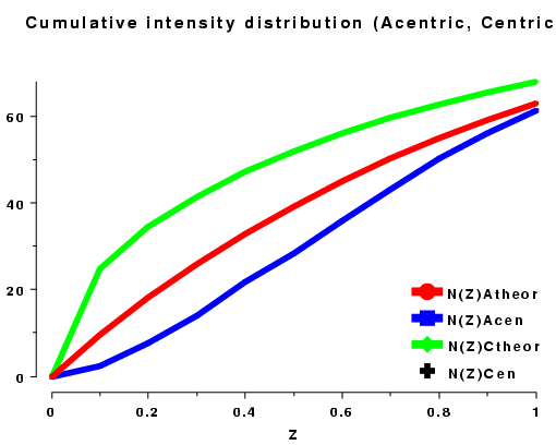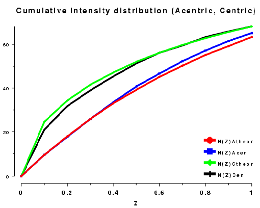 The cumulative intensity distribution plots the percentage of acentric and centric reflections where (Z(h) is less than 0.1, 0.2, up to 1.0. For a crystal with more or less randomly distributed atoms this follows a predictable distribution, as can be seen by plotting the output of TRUNCATE or ECALC (see also Figure CL below). The distribution can be misleading if the data is of poor quality, or there is strong translational non-crystallographic symmetry, which may cause whole classes of reflections to be virtually unobserved.