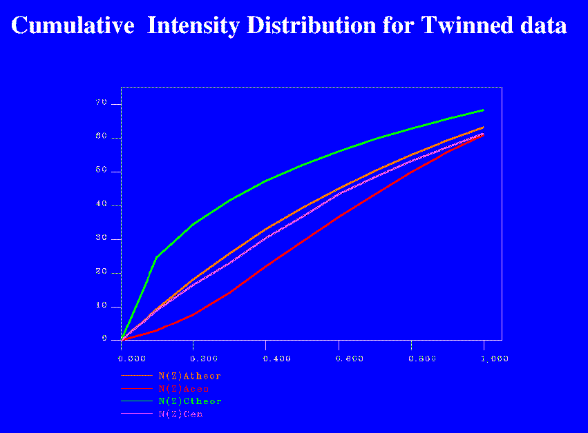 Example of a cumulative intensity distribution with twinning present, as plotted by TRUNCATE. (A full size version of the example can be viewed by clicking on the small picture.)
