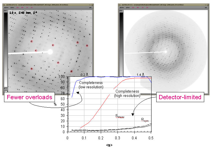 - Ultra-high resolution reflections are normally weak and therefore long exposure times are required. As a result the low resolution reflections are lost due to overloaded pixels.